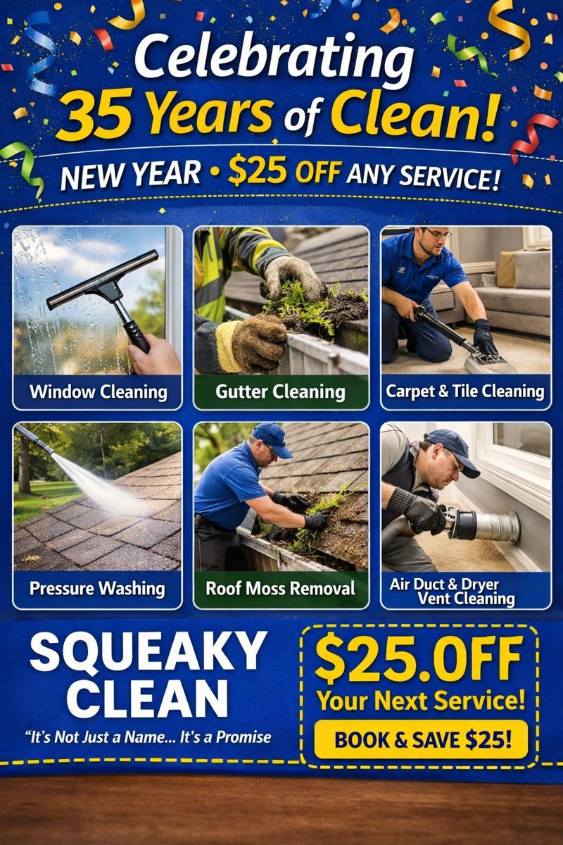 With over 30 years of experience, Squeaky Clean provides dependable residential and commercial cleaning services you can trust. Our trained professionals deliver high quality interior and exterior cleaning with a focus on reliability, detail, and customer satisfaction.
